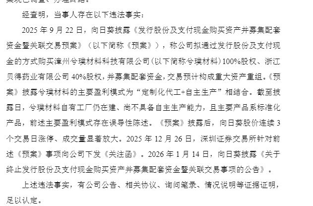 经查明,激勉这次处罚的非法事实发生在2025年9月22日。当日,向日葵涌现了一份《刊行股份及支付现款购买钞票并召募配套资金暨联系来往预案》(以下简称预案),称公司计算通过刊行股份及支付现款的形势,收购漳州兮璞材料科技有限公司(以下简称兮璞材料)100%股权和浙江贝得药业有限公司40%股权,该来往瞻望组成要紧钞票重组。